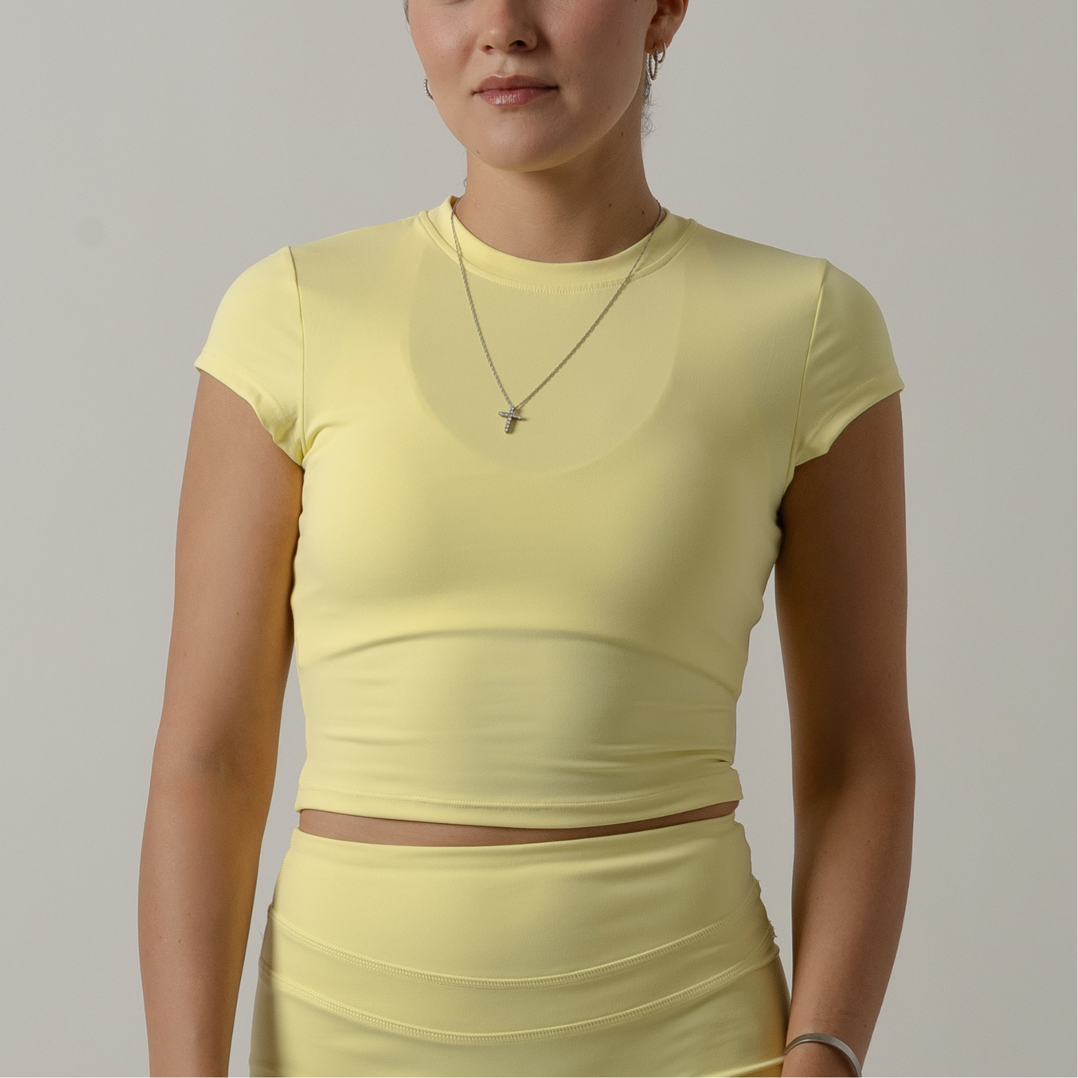 Nuestro top con mangas cortas Glow Lemon destaca por su color vibrante y un fit que realza tu figura. combínalo con el sport bra y shorts de la colección GLOW.