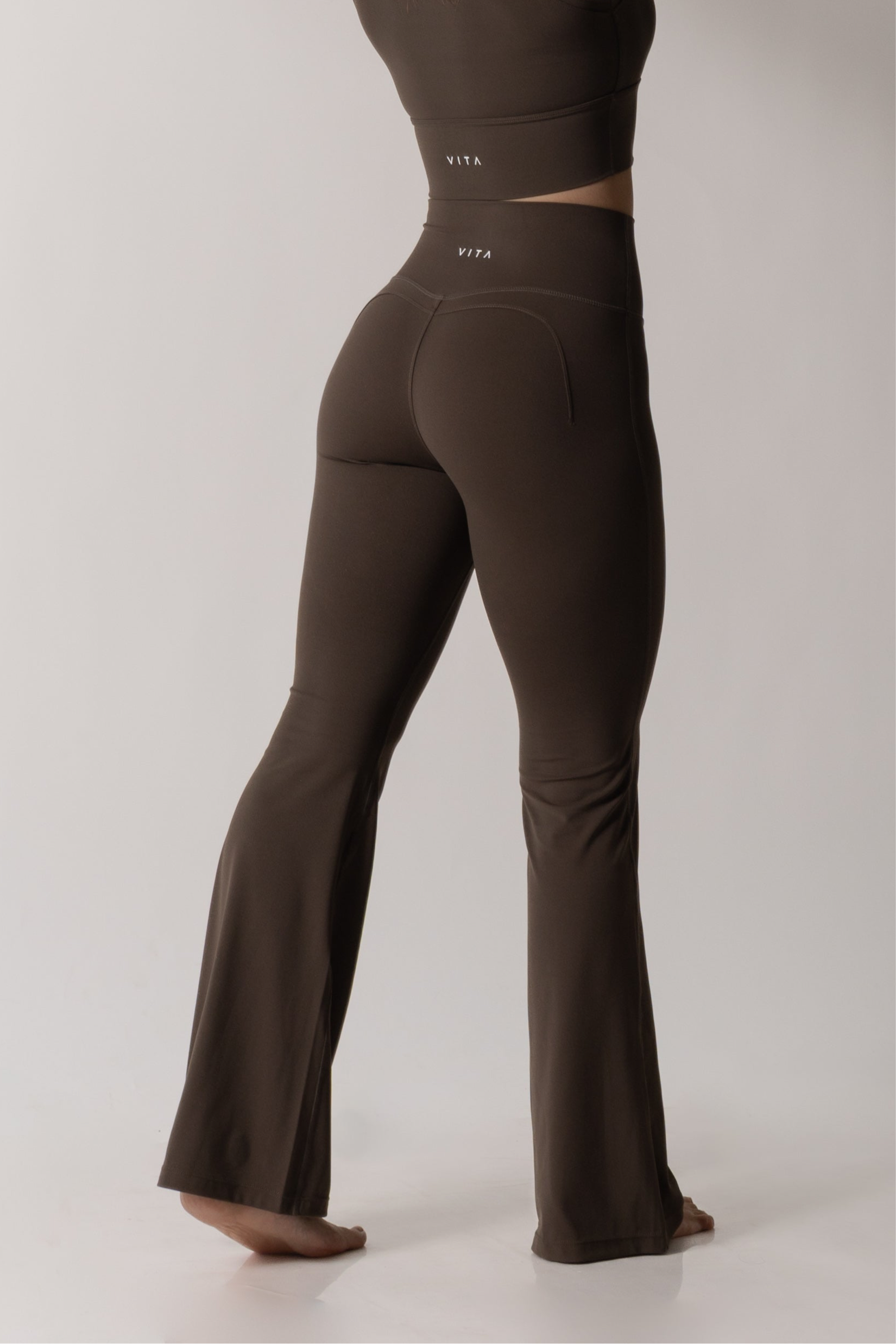 Diseñados para moverte con libertad y estilo, nuestros leggings flare en tono mocha combinan lo mejor del confort y el diseño funcional. Confeccionados en una tela suave y de alta elasticidad, ofrecen un ajuste favorecedor que se adapta a tu cuerpo sin perder su forma. La pretina ancha de tiro alto brinda soporte en el abdomen y estiliza la silueta, ideal tanto para tus prácticas de yoga como para looks athleisure del día a día.